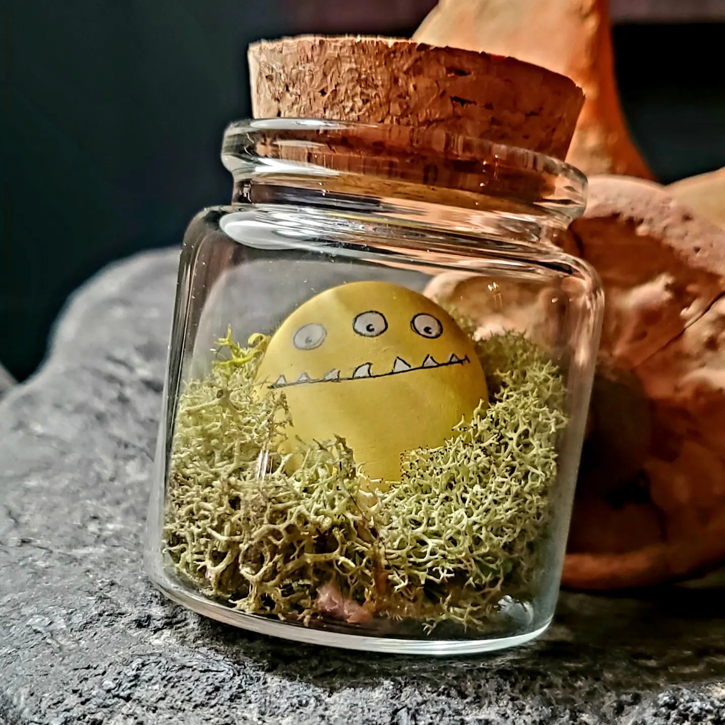 Hand painted little stone monster contained in its own little terrarium.