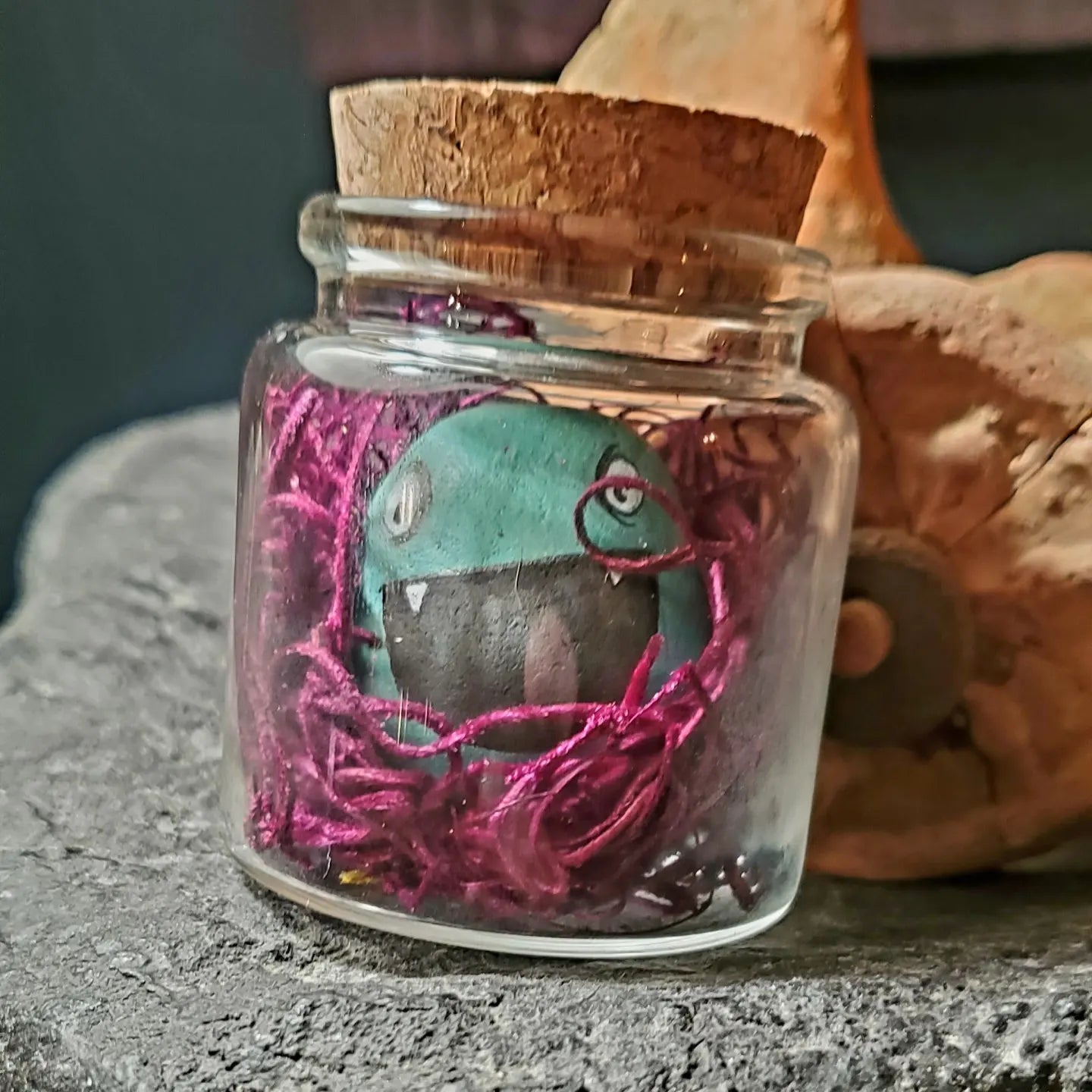 Hand painted little stone monster contained in its own little terrarium.